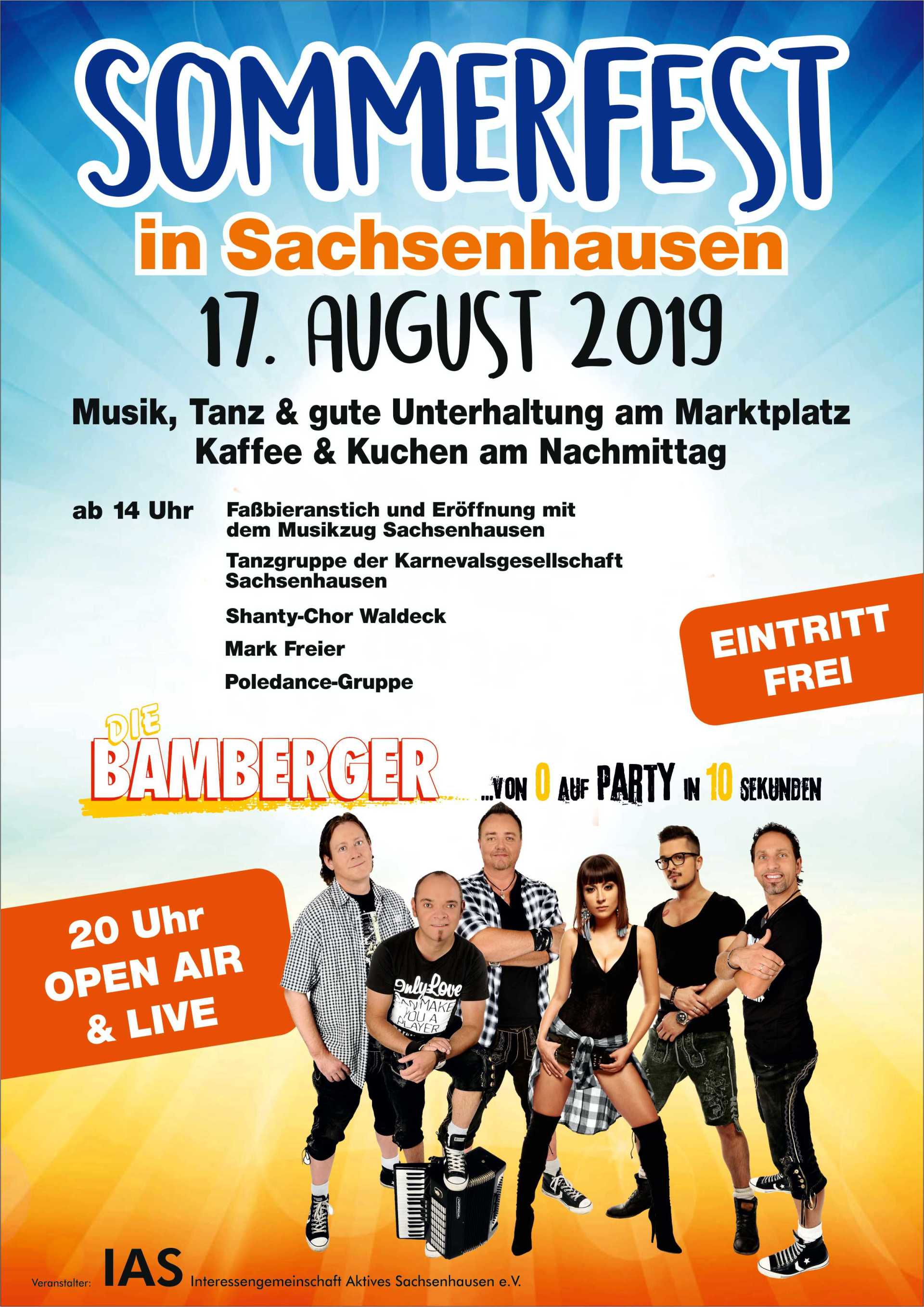Die Interessengemeinschaft Aktives Sachsenhausen lädt am Samstag, 17. August 2019 wieder zum Sommerfest auf den Markplatz in Sachsenhausen. Mit der Band „Die Bamberger“ ist wieder ein auch in der Region bekannter Publikumsmagnet verpflichtet worden. „Die Bamberger“ werden ab 20 Uhr aufspielen. Bereits das Nachmittagsprogramm bietet den Besuchern vielfältige musikalische Unterhaltung: Mit dem Musikzug der Freiwilligen Feuerwehr Sachsenhausen beginnt bereits um 14 Uhr das Nachmittagsprogramm. Im Stundentakt schließen sich Tanzgruppen der Karnevalsgesellschaft Rot-Weiß Sachsenhausen, der Edersee-Shanty-Chor aus Waldeck und Mark Freier, Singer und Songwriter aus Korbach, an und sorgen für Kurzweil und gute Unterhaltung. Höhepunkt des Nachmittages ist eine Showeinlage der PoleDance-Gruppe um Lisa Elzer und Diana Neubauer vom Studio Pole2Dance aus Baunatal. Begleitet werden die beiden Akrobatinnen von Sängerin Maria Gerhold. Mit Kaffee und Kuchen, den die Schützengesellschaft 1604 Sachsenhausen anbietet, und frischen Schmankerln vom Grill von der Metzgerei Ludwig Tent aus Korbach ist neben dem Bühnenprogramm auch für beste Verpflegung gesorgt.